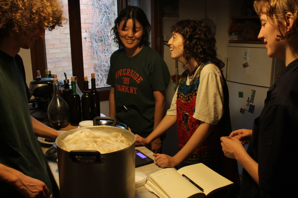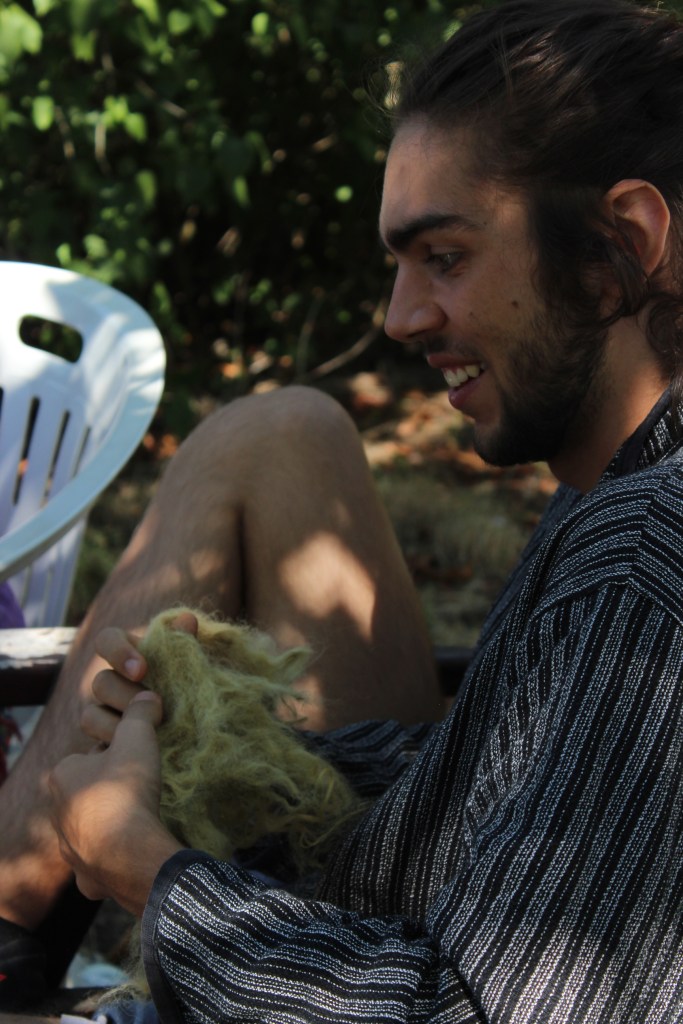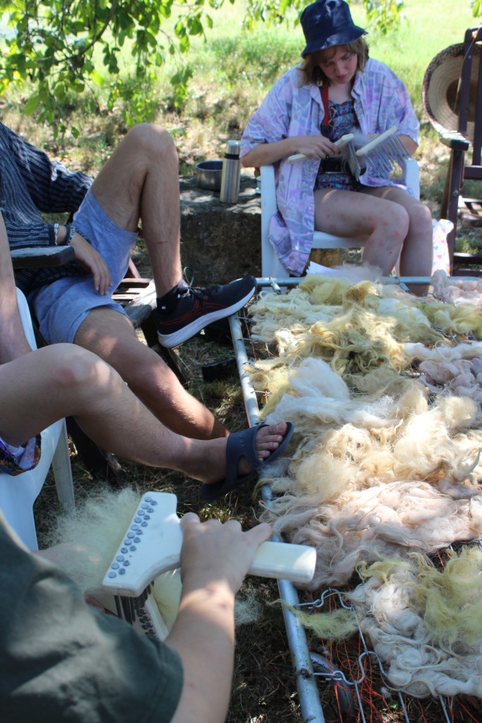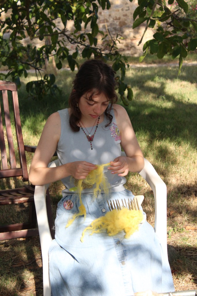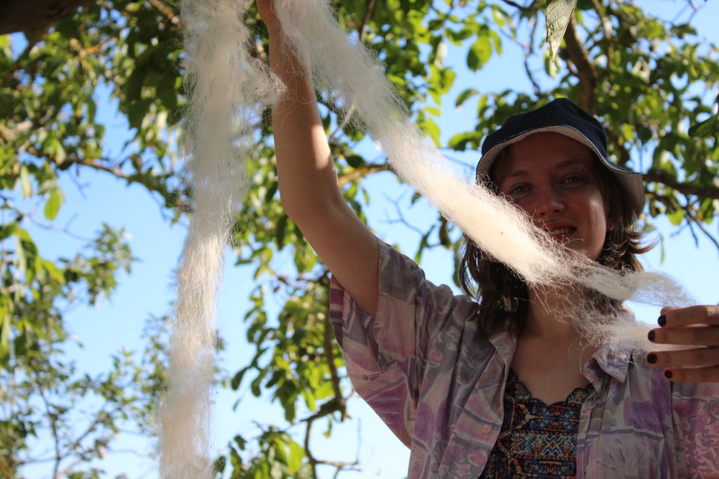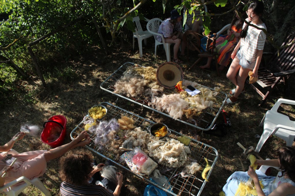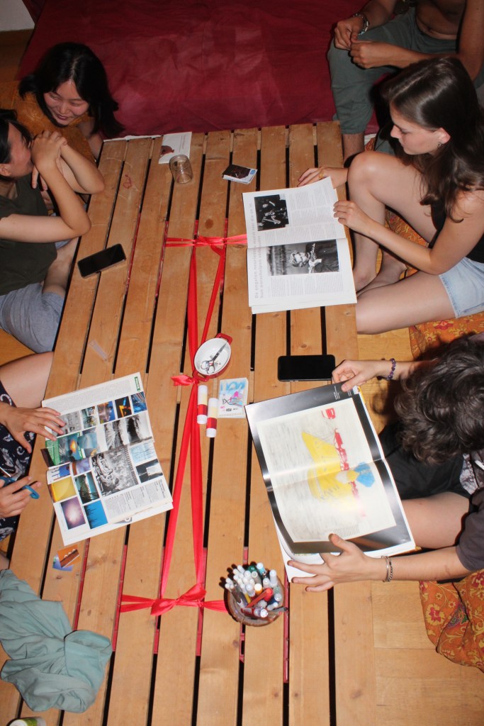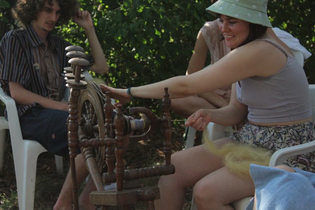 Lisa and Raven combined their knowledge on woolspinning and plant-dyeing in this workshop. Over two weeks, they led the group throughout the whole process: from visiting a closeby sheep farm to gather wool, to collecting plants, to cleaning, natural dyeing, carding, and spinning the wool into a long colorful thread that connected all the various exhibition spaces during the final party.