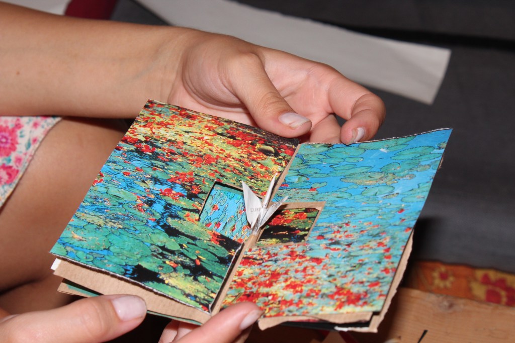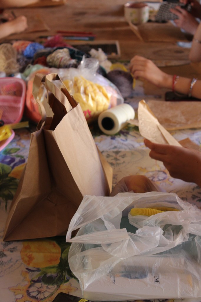 Jiwoo guided the participants in weaving with recycled materials, such as strips of plastic bags. Using what would otherwise turn into trash, this workshop taught the participants how to create framed woven art, and discussed sustainability through up-cycling.